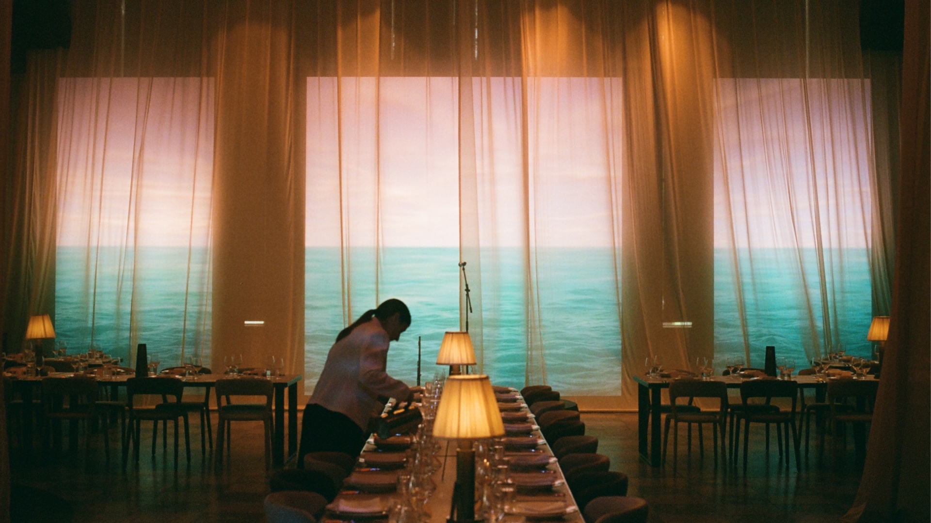 On-screen content featured a sun moving slowly across a seascape throughout the afternoon, subtly shifting in colour and tone before settling into warm sunset hues. With the screens positioned across the front and wings, this motion and colour progression felt expansive - like the horizon stretching across the room - mirroring the rhythm of the day and reinforcing the sensation of time slowing down and stretching on.