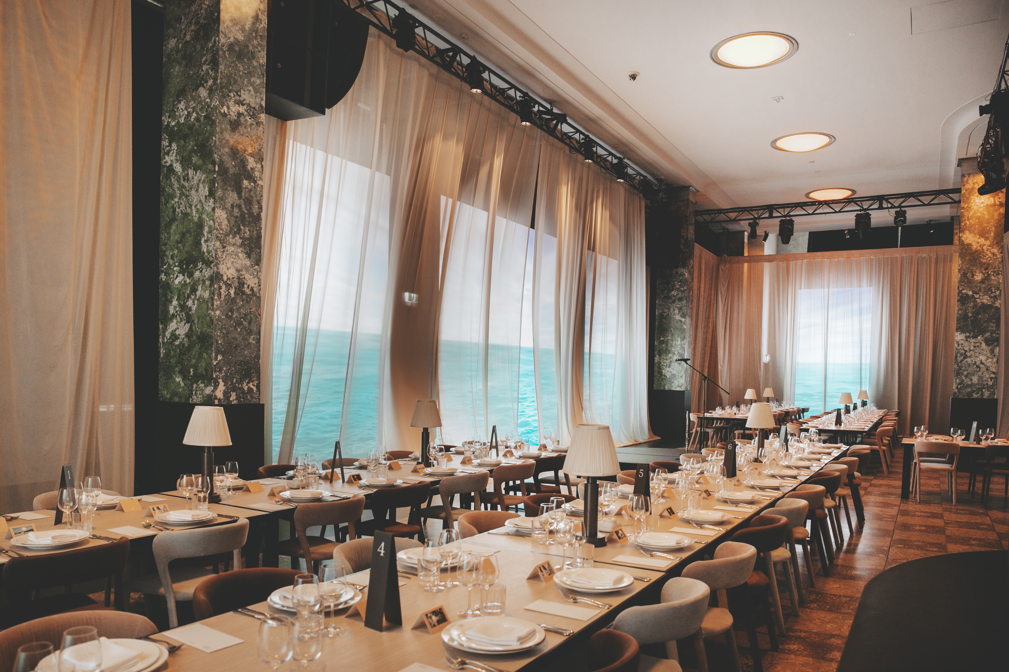 To soften the technical structure and elevate the atmosphere, the entire LED canvas was layered behind sheer draping. This treatment diffused the brightness, softened edges, and added a tactile, almost cinematic quality to the visuals. The LED became less of a screen and more of a glowing environment - an architectural light feature that transformed the hall into something dreamlike and transportive.
